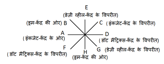 आठ व्यक्ति A, B, C, D, E, F, G और H एक दूसरे के बीच समान दूरी पर एक गोल मेज के चारों ओर बैठे हैं, लेकिन इसी क्रम में हो जरूरी नहीं है। कुछ लोग केंद्र की ओर देख रहे हैं जबकि कुछ लोग बाहर की ओर देख रहे हैं (यानी, केंद्र के विपरीत दिशा में)। प्रत्येक व्यक्ति अपने कार्यालय में विभिन्न प्रकार के प्रिंटर चाहता है। प्रिंटर केप्रकार हैं- डेज़ी व्हील प्रिंटर, डॉट मैट्रिक्स प्रिंटर, इंकजेट प्रिंटर, ड्रम प्रिंटर लेकिन जरूरी नहीं इसी क्रम में हो। केवल दो लोग एक ही प्रकार के प्रिंटर का उपयोग कर सकते हैं और वे एक गोले में एक-साथ और एक दूसरे के सामने नहीं बैठे हैं।