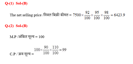 एक डबलबेड की कीमत 7500 रू. चिन्हित की गई है। दुकानदार उस पर 8%, 5% और 2% की आनुक्रमिक छूट देता है। निवल बिक्री कीमत बताएं।