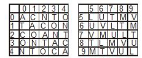 एक शब्द केवल एक संख्या-समूह द्वारा दर्शाया गया है, जैसा कि विकल्पों में किसी एक में दिया गया है। विकल्पों में दिए गए संख्या-समूह अक्षरों के दो वर्गों द्वारा दर्शाए गए हैं, जैसा कि नीचे दिए गए दो मैट्रिक्स में है। मैट्रिक्स 1 के स्तम्भ और पंक्ति की संख्या 0 से 4 दी गई है मैट्रिक्स -II में 5 से 8। इन मैट्रिक्स से एक अक्षर को पहले उसकी पंक्ति और बाद में स्तम्भ संख्या द्वारा दर्शाया जा सकता है। उदाहरण के लिए 'C' को 12,20, 43 आदि द्वारा दर्शाया जा सकता है तथा 'U' को 56, 65, 77 आदि द्वारा दर्शाया जा सकता है। 'AMOUNT' की संख्या क्या होगी?