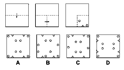 कागज का एक टुकड़ा मोड़ा और काटा जाता है जैसा कि नीचे दिए गए प्रश्न की आकृतियों में दिखाया गया है। दिए गए उत्तर आकृतियों में से चयन करें, कि खोलने पर यह कैसा दिखाई देगा?