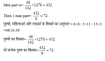 1278 रुपयों को 6 पुरुषों, 5 महिलाओं और 3 लड़कों के बीच बांटा गया। एक आदमी, एक महिला और एक लड़के के हिस्से का अनुपात 8: 11: 13 है। एक आदमी का हिस्सा क्या है?