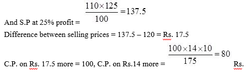 S.P. at 20% profit = Rs. 120, C.P. on 10% more = Rs. 110