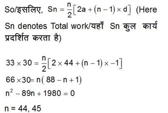 33 व्यक्ति किसी काम को 30 दिनों में पूरा करते हैं यदि 44 व्यक्ति इसी काम की शुरूआत करें और प्रत्येक दिन के बाद 1 आदमी काम छोड़ दे तो कार्य कितने दिनों मे पूरा होगा?