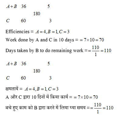 A, B और C के समान ही कुशल है। A और B एक साथ काम करके 36 दिनों में एक काम पूरा कर सकते हैं और C अकेले इसे 60 दिनों में पूरा कर सकते हैं। A और C 10 दिनों के लिए एक साथ काम किये, B अकेले शेष कार्य को पूरा करेगा?