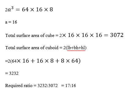यदि एक घनाभ जिसकी आयाम 64 सेमी ×16 सेमी ×8 सेमी है, को पिघलाया जाता है, और समान आकार के दो घनो में पुनर्गठित किया जाता है , तो घनाभ के सम्पूर्ण पृष्ठ क्षेत्रफल और दो घनों के सम्पूर्ण पृष्ठ क्षेत्रफल का अनुपात ज्ञात कीजिये ?