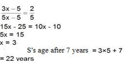 D और S की वर्तमान आयु का अनुपात क्रमशः 3 : 5 है । 5 वर्ष पूर्व उनकी आयु का अनुपात क्रमशः 10 : 25 था । 7 वर्ष बाद S की आयु क्या होगी?