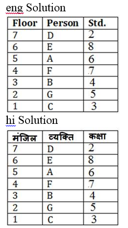 सात व्यक्ति A, B, C, D, E, F, और G सात अलग-अलग मंजिल की इमारत में रह रहे हैं, ऐसे में भूतल को 1 और शीर्ष मंजिल को 7 के रूप में गिना जाता है। प्रत्येक व्यक्ति अलग-अलग कक्षा 2वें, 3वें, 4वें, 5वें, 6वें, 7 वें और 8वें में अध्ययन करते हैं लेकिन जरूरी नहीं कि इसी क्रम में हों।