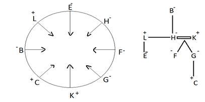 K, B, C, L, E, F, G और H केंद्र के सामने एक वृत्त के चारों ओर बैठे हैं लेकिन जरूरी नहीं कि इसी क्रम में हों।